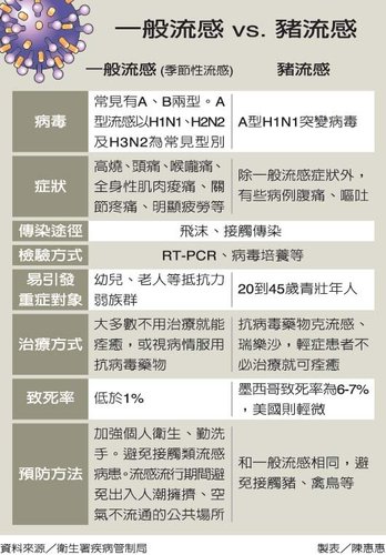 - 較難以預防的是,SARS是發燒後才有傳染力,然而豬流感發燒前一天就有傳染力,難以用發燒來作為預防擴散感染,所以一但有疫情傳出就得全面預防!如~感染者相關地方停班停課,相關者在家自我隔離,一有感冒症狀通知疾管局(免付費疫情通報及諮詢專線1922)!