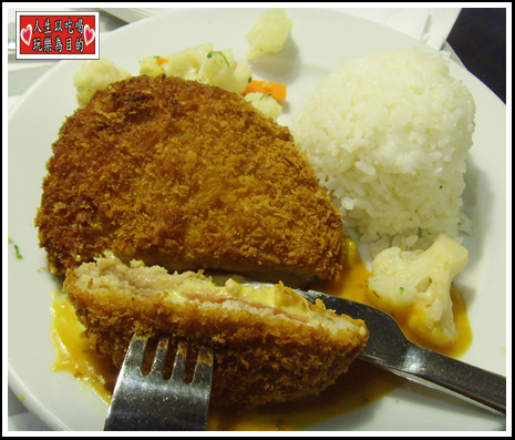 起司豬排外層有酥脆麵包粉加持,一口咬下有著輕脆的咔滋聲,軟嫩熟度恰好的豬排肉中間夾著火腿片,以及半融化的起司片。坦白說,豬排口感普普通通,就像超市冷凍貨,不過因為附有特製黃芥末沾醬緣故,整體水平提昇不少。