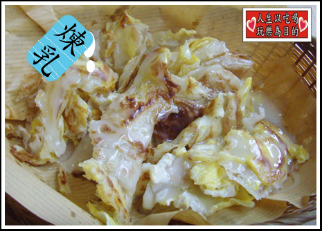 跟咖哩口味相同,也是加蛋的印度餅,只是沾醬換成淋上厚厚的煉乳。(話說回來,蔥抓餅&甜煉乳的組合,光想就覺得怪怪滴!!)戰戰兢兢吃下第一口,很甜,很脆,帶點鹹,熱熱吃,還不賴呢,愈吃愈順口,我喜歡這個更甚咖哩口味。