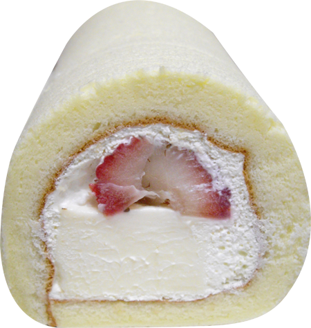 柔軟海綿蛋糕圍夾著鮮奶油、新鮮草莓、奶凍塊。