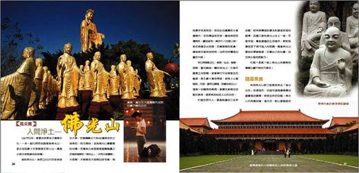 遠眺佛光山,身長120公尺的金身接引大佛,在燦爛陽光下與480尊塑金的立身佛陀,相互輝映,成為佛光山最顯著的地標。而擁有古典宮殿建築魏峨矗立於高屏溪畔的「佛光山」,共有大雄寶殿、大悲殿、大智殿及大碩殿四座寺廟;每座廟宇各具特色,例如佔地廣闊的大雄寶殿內,祀有釋迦牟尼佛、藥師佛和阿彌佛陀,牆面更有一萬四千八百個小洞,奉祀佛像及光明燈,莊嚴肅穆的氛圍,讓信眾在參拜的同時,自然而然獲得心靈的平靜。