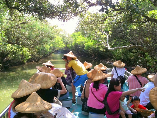 船行不到五分鐘,我們便看到了許多珍貴的紅樹林植物,後來查訪資料得知,國際紅樹林組織(International Society for Mangrove Ecosystem)表示全世界目前有62科30屬243種的紅樹林植物;而紅樹林指的是一群生長於熱帶或亞熱帶海岸最高潮線以下及平均高潮線以上間的喬木或灌木,並非單指某一種植物,所以真正的紅樹林則是具有胎生、呼吸根、支撐根等特殊演化的特性,可以維持濱海濕地生態,是兼具防風、抗海潮侵蝕等功用的好植物;過去在台灣紅樹林植物有細蕊紅樹、紅茄苳、水筆仔、五梨跤、海茄苳、欖李,現僅存水筆仔、五梨跤、使君子科的欖李及馬鞭草科的海茄苳等四種。
