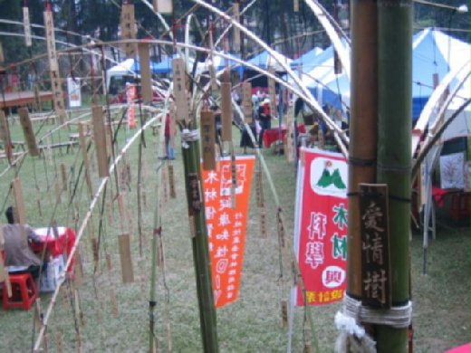 一、愛情樹,於95年11月中旬的某一個午后,在溪頭森林遊樂區的步道被發現,經考據,這一棵愛情樹是一群藝術家的竹藝創作,她就站立於步道旁,供天下有情人撰寫心事,然後將它高掛於樹梢。有一對情侶說,這就是:「天地為證,山水為媒」。