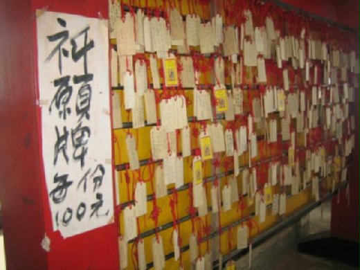 janeju&丸子說:(好像黃山上的愛情鎖一樣)(看祈願牌裏滿滿、小小的心意,覺得感動;但左下角的"每份一百元",可惜覺得物化了。)(如果可以的話,我也會立個祈願牌和祈願樹,所有的人不分貴賤、免費的來祈願,我會為所有寫上的每個心願禱告..........我小小的心願。)
