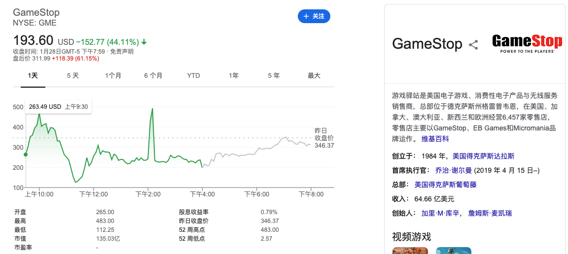 另外,美國股市是沒有漲跌幅限制的,GameStop(GME)昨天的股價:開盤263.49美元,最高492.02美元,最低126.01美元,收盤197.44美元,盤後又漲回346.37美元!