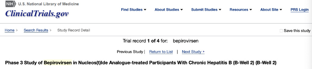 bepirovirsen(GSK836)最新研究進展:這是一種研究階段反義寡核苷酸(ASO),由英國葛蘭素史克生物製劑(GSK Biologicals)與Ionis公司合作開發。 最近,Ionis公司宣佈,GSK公司已將bepirovirsen推進到第3期臨床開發階段。