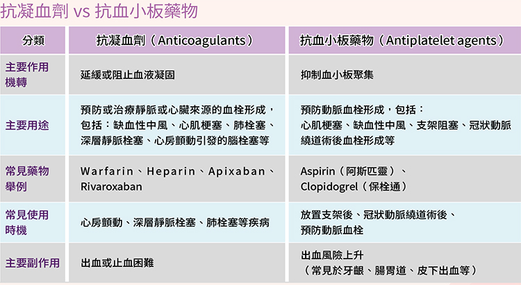 抗血小板藥物(antiplatelet agents)則是透過抑制血小板聚集來預防動脈內血栓形成,常用於預防心肌梗塞、中風及支架阻塞等。典型用藥如Aspirin、clopidogrel等,尤其在放置心臟支架或接受冠狀動脈繞道術後,患者常需長期使用。其主要副作用亦為出血風險上升,常見於牙齦、腸胃道及皮下。