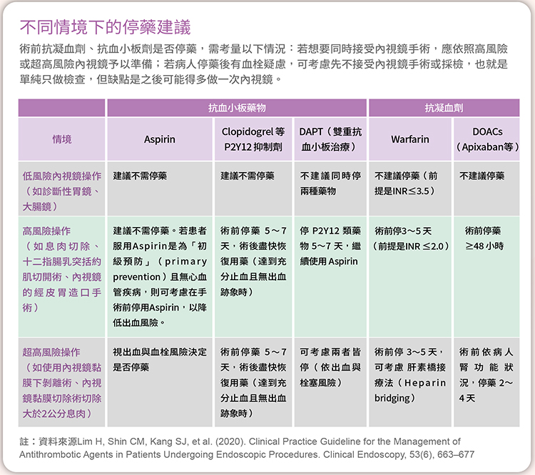 3.對於直接作用型口服抗凝血劑(directacting oral anticoagulants, DOACs),如apixaban、rivaroxaban、dabigatran、edoxaban,多數情境下在接受治療性內視鏡前應停藥。