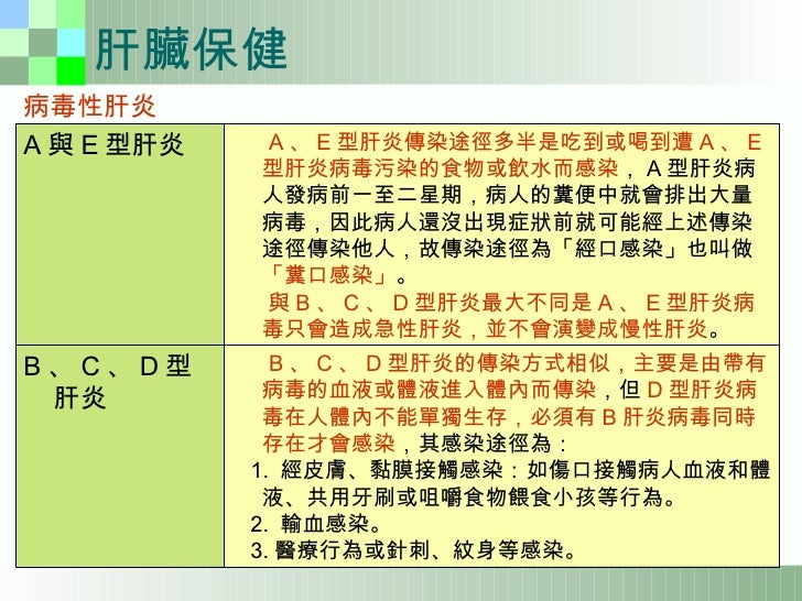 其中以病毒性肝炎最常見,又可分A、B、C、D、E五種。其中A型及E型肝炎只會引起急性肝炎,而B、C型肝炎會演變成慢性肝炎,甚至會成為肝硬化及肝癌的主因,而成為最具危險性如同定時炸彈。因此B型及C型肝炎是我們每一個人應特別注意及預防與治療的重點。