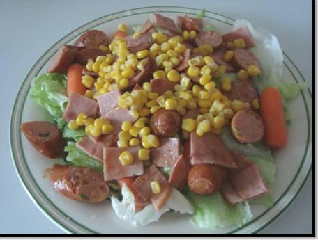 生菜,熱狗,水煮蛋,玉米粒,蟹腳,火腿,紅蘿蔔,葡萄乾