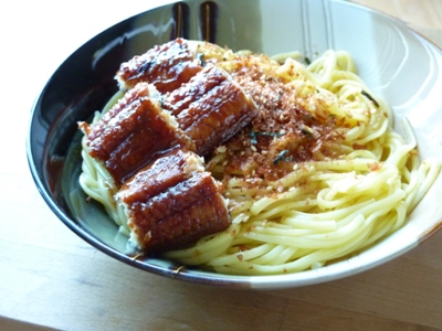 麵條煮熟後過冷水。撈起瀝掉水。加入少許的涼麵醬油拌一拌,然後灑上海苔粉。最後切幾塊鰻魚擺排就好了。