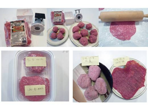 先看過包裝上的成分說明。寫著叭啦叭啦雞哩刮啦。。喔。。3oz,180卡路里。搬出我的小秤子。一瓢瓢的秤。每3 oz就揉成一坨球。。這樣一包下來。我也揉了八大顆(每顆180卡)+四小顆(每顆90卡)。