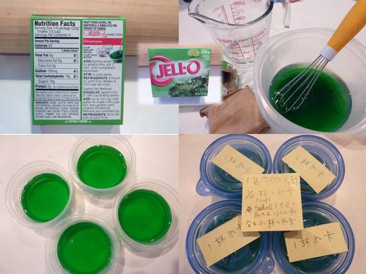 盒子上說了一包可以做成兩杯,半杯相當80卡。。真是誘拐人家讀英文會跳著讀的。。那就是一包果凍粉做出來的整整兩杯果凍就是320卡!!! 天喔。。也不少耶。。所以臨時決定,把做出來的兩杯份量,分成四小杯。一小杯等於80卡。。又是一堆標示。然後放到冰箱去等他結凍就好了。