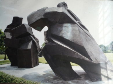 「門」,銅鑄雕塑,1986年製成,是朱銘的「太極系列」中最後一個大系列「拱門」的首件作品。「門」外形如兩人對招,跟學術切磋砥礪的精神暗通。「門」表面的質感跟中大的石壁相似,既是「太極系列」的一個新變化,也跟環境和諧地融合。與單件作品的相異的地方是──太極單件作品因為要刻畫動感,有需要營造一種近乎失衡的感覺,從而展示平衡和動感,但在兩個組件組合成的作品中,兩種失衡剛好能夠互補成為穩定的形狀,卻能保存動態,所以能給人一種圓滿的感覺。
