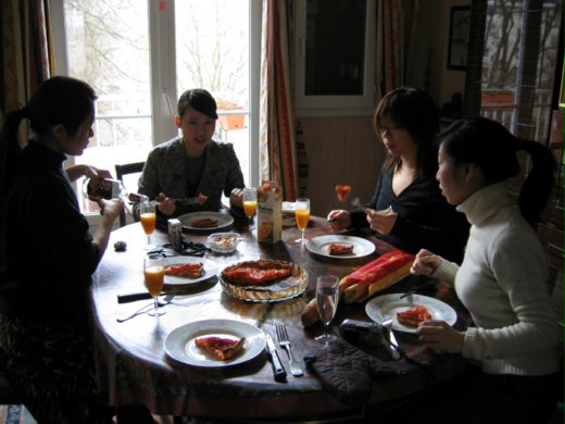 昨天請了在法國認識的一群台灣妹妹到家裡來吃飯, 男主人在工作, 家裡沒大人, 一早我就開始整理家裡, 張羅吃的, 等客人來了, 我們就像一群玩法式辦家家酒的台灣小孩, 從開胃菜開始一道一道的上, 大家一邊聊天一邊品嘗, 前菜 主菜 甜點, 接著下午茶..... 當女主人, 讓我有[家]的感覺.
