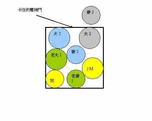 停車場在B3, 由於車子就剛好停在電梯入口旁邊, 我們很自然的搭了電梯, 門正要關上的時候跑來了一位老先生(老夫1), 我們按住了鈕讓他進來, 他一進來就護住了門叫後面的太太(老妻1)快一點, 然後陸續又來了其他人, 最後來的一對夫婦(夫3妻3)本來擔心太重要改搭下一班, 但是電梯內顯然還有空間, 大家就請他們入內一試, 超重鈴沒有響, 電梯門徐徐關上, 然後我們開始上升, 上升的速度異常緩慢, 而且不順, 怎麼說不順呢, 就是一頓一頓的上升, 大家只覺得或許我們重了點, 覺得反正才四層樓, 很快就到了. 到了地面層時, 電梯重重的頓了一下, 然後. . . . . 門. . . 就是. .不. . 開, 這時我們才注意到面板上的人數限制 - 4人 325kg!!! 而我們一共七個人擠在這個空間裡頭!!!!! 老夫1急忙按了所有的鈕, 沒有反應, 夫3按了通話鈕!!