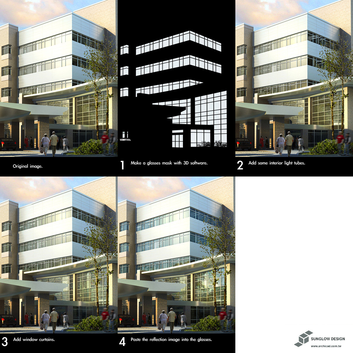 外觀部分單純使用3D計算後的玻璃看起來很單調,可以計算一個只有玻璃的遮罩,就可以在photopshop裡單獨把玻璃部分選取出來,加入室內燈光,窗簾以及顏色調整,使玻璃的部分生動有層次。