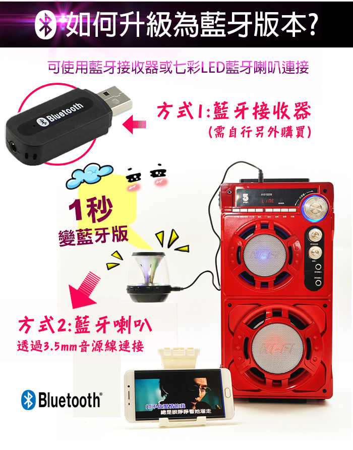 標準配件:主機x1、3.5mm音源線x1、USB充電線x1、遙控器x1、說明書x1