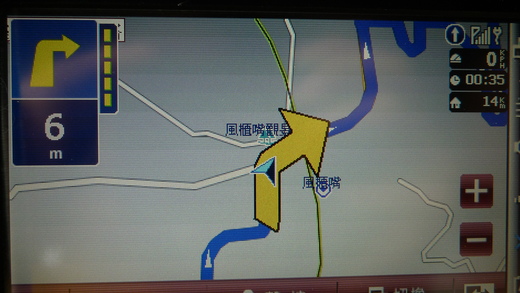 圖三: 衛星導航圖示. 風櫃嘴要右轉. 此時離下目標萬里市區剩14公里.接下來幾乎是險降坡.而且有一段很長的路是沒路燈.晚上開車務必要小心喔.