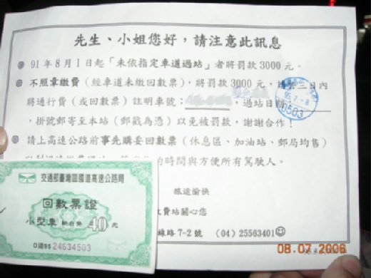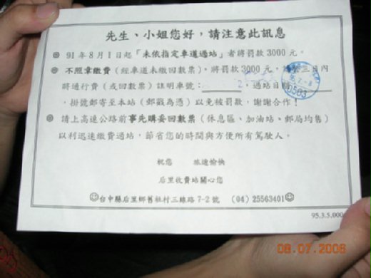 6.在三天內經過收費站(建議還是走現金車道)時交給收費小姐就可以銷案了(切記!