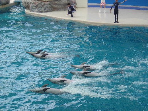 用完餐後,在11:40am就可以到海豚劇場入場,準備看12:10pm的海豚秀。本表演大約30分鐘,這個秀非常熱門,會建議早點入場。海豚主要會表演跳球、搖呼拉圈等各種表演 。看完後就可以搭乘纜車前往 "水晶城堡區" (早點搭過去,因為這時間搭纜車的人非常少,這樣就可以全車都是認識的人)。到達後可以先走到 "布萊登海岸區" 享用刺激的快感。這時候很少遊客會在玩遊樂設施,因此省去許多排隊的時間。在約13:15左右回到 "水晶城堡區",看新的秀--飛越海洋。飛越海洋的表演約30~40分鐘,建議早點入場,而且建議坐在中間排數、中間區塊的旁邊位置,因為要離開時較容易早點離開,且在表演中,舞台會有爆破、火燄等效果,許多人都會被嚇到。本劇主要是以一個小女孩的夢境作為全劇的主軸,雖然故事的張力稍嫌不強,但是全劇無論在音樂或是舞蹈的搭配,頗能扣人心弦。這部秀是目前台灣相似的秀中最好看且最有水準的秀之一。