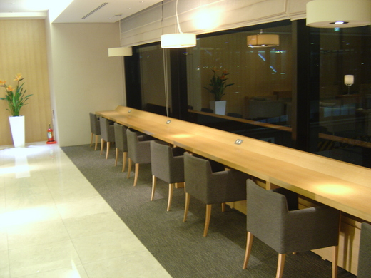 另外一區為商務艙區域,色系以米棕色系為主。商務艙區大部份的座椅為兩兩對座之型態,同時為了方便要處理公事的人,也有一排面向窗戶的座椅和桌子,在桌上有著筆記型電腦的插頭。這樣的設計我目前在日航東京成田機場貴賓室、澳航雪梨機場貴賓室等都有看過這樣的設計。在商務艙區最令人讚賞的就是食物區,無論麵包、壽司、飲料等應有盡有。
