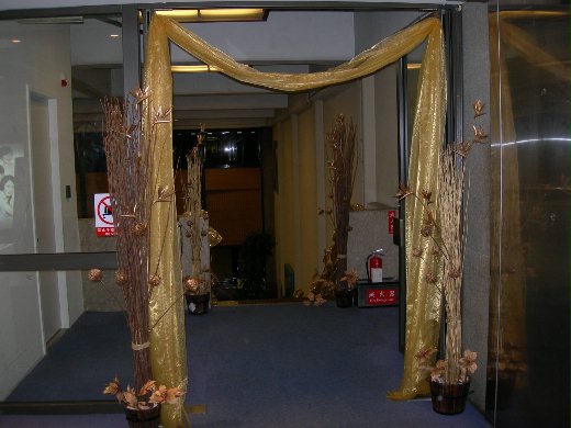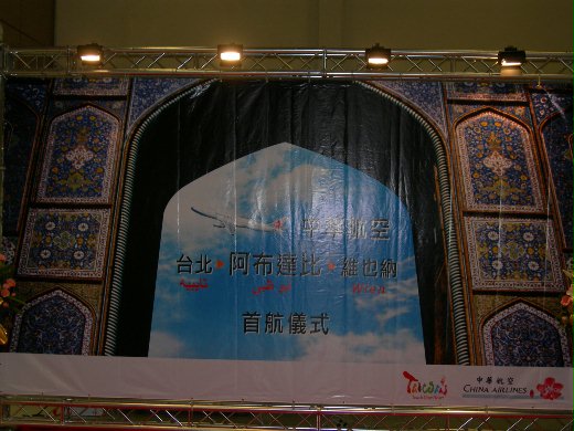 4/25是華航台北-阿不達比-維也納首航的日子。晚上抵達中正機場後,經過例行的手續後就抵達登機門。抵達登機門時發現頗有阿拉伯風味呢。經過了開航典禮,旅客領了首航紀念品—乳酪鳳梨酥—後,魚貫進入機艙後,飛機關艙門、後推、滑行和起飛。