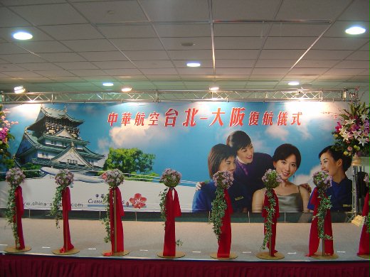 往大阪的首航儀式在D2登機門舉行,經過貴賓致詞與剪綵以後,旅客魚貫的登上CI-156前往大阪的班機。本次首航的禮物為水果機的模型飛機,而在飛機上空服員也發送限量的大阪首航撲克牌,非常好看。乘客全部登機以後,班機緩緩後推、滑行,由23號跑道起飛,前往大阪。台北-大阪飛行時間為二小時十分鐘,商務餐餐點有三種選擇 (蜜汁子薑鴨甫佐XO醬時蔬、蘑菇醬汁扒菲力和日式餐點),而這些餐點也是華泰飯店特地為華航所設計一系列餐點中的一部份。