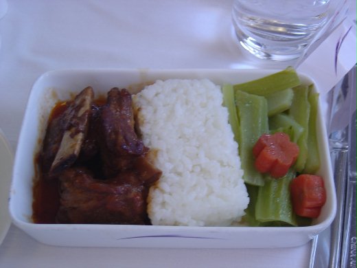 在提供主菜之前,每人都有一份佐酒小食和沙拉,看起來好看的,而且嘗起來也不錯。接下來就是主菜了,本航線主菜有三種:香菇醬汁牛柳、冬菇栗子雞肉飯和京都排骨飯,三種都是偏中式的口味,因此相信也較符合國人的味口囉。本次我選的是京都排骨飯,肉類有三塊排骨,青菜類有兩種。排骨的味道嘗起來非常不錯,也不會很硬;不過青菜部份可能因為加熱的關係,味道不太好聞,嘗起來也不是很好吃。