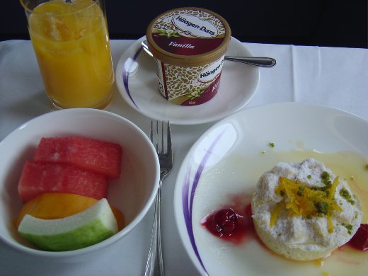 甜點部份有提供法式香橙布丁、冰淇淋 (香草和巧克力餅乾兩種口味) 和水果,很幸運的我三種都有品嘗到。法式香橙布丁嘗起來酸酸甜甜的,非常好吃;冰淇淋為國際知名品排Häagen-Dazs,也非常好吃;至於水果,水份不少而且甜度夠,非常完美。