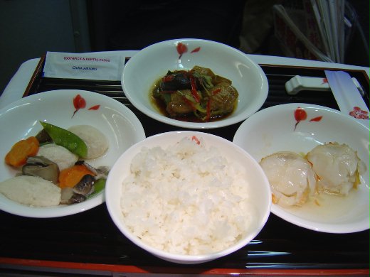 雖然是已經是凌晨時分,但是華航還是提供了一份非常豐盛的便餐給頭等艙的乘客。便餐分成中式與 "無國界創意料理" 兩種,今天點選的為中式便餐。雖然說是便餐,可是該有的可是一樣也不少喔。首先登場的為中式前菜--蘆筍鮑魚捲襯燻鴨沙拉,因為口味的問題,雖然沒有品嘗,不過光是看到菜的外觀就心滿意足了。接下來是湯品--兩筋一鮮湯,雖然不知道所謂的 "筋" 是什麼,不過 "鮮" 就是蝦子囉。這份湯品非常鮮美,頗為好喝。再來就是餐點的重頭戲:雙冬燒釀翅、瑤柱玉龍皇、琵琶嫩豆腐配上絲苗米飯。雖然每樣菜份量都不多,但是卻非常的精緻與可口,當然,吃到此已經有八分飽了。