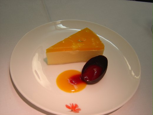 主菜吃完後,接下來就是水果跟甜點了。華航頭等艙的水果服務是空服員會將水果以推車推出,讓乘客做選擇。這樣乘客都可以選擇自己想要用的水果,當然還有起司跟餅乾可以選擇囉。在甜點部份,有芒果慕思蛋糕和Haagen-Dazs冰淇淋,兩樣都非常可口。用完了便餐,已經差不多台北時間凌晨一點半了。在客艙散個小步之後,伴著飛機引擎聲入眠。在長途飛行中,各艙等都有提供點心,頭等艙的點心有三種:魚丸米粉湯、川味擔擔麵和咖哩雞千層派。不過因為實在是太累了,一覺睡到早餐時間。