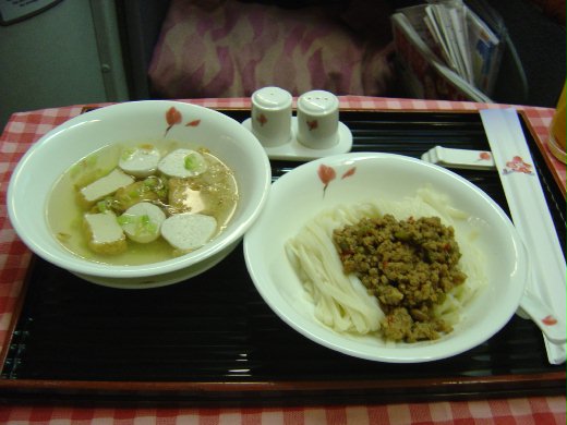 在降落前兩個半小時,客艙燈光緩緩亮起,到了早餐時間。早餐有西式早餐和中式早餐,中式早餐是由國賓飯店所設計的。不過因為我不喜歡西式的味道,也不喜歡中式早餐,因此請空服員準備了特製早餐。這頓特製早餐非常豐富,有商務艙的點心--炸醬麵、頭等艙的點心--擔擔麵和 "改造" 過後的頭等艙點心--沒有米粉的米粉湯,吃起來超級可口,真是感謝空服員了。