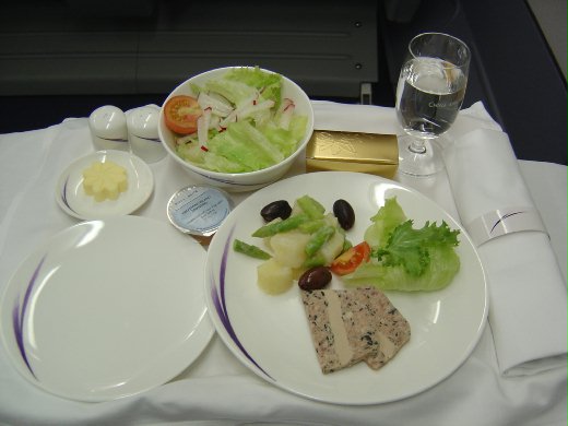 傍晚登上了華航曼谷飛台北的班機,雖然還沒有到用餐時間,不過肚子不爭氣的咕嚕咕嚕叫,此時華航也貼心的適時提供了晚餐服務。曼谷飛台北如同台北飛曼谷一樣,首先登場的是前菜跟沙拉,賣相非常好,不過因為我對於某些太過於高級的料理敬謝不敏 (如:生魚片等) ,因此無法告知各位看倌到底味道怎麼樣囉~