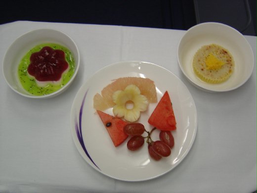 接下來就是主餐了。因為是從泰國起飛的班機,因此少不了泰式料理--泰式紅咖哩雞肉飯,此外還有中式海鮮麵和牛排。這次我選的是中式海鮮麵。豐盛的海鮮菜餚加上香菇和花椰菜,嘗起來非常不錯,因此在短時間之內就盤底朝天了。美中不足的是 "麵" 吃起來像台灣的 "泡麵" ,感覺跟在台灣吃麵食料理差蠻多的,不過聽說泰國的麵大部份都是像這樣子,那就入境隨俗囉。至於甜點有兩種,一種是奇異果醬紅莓奶酪,另一種是泰式南瓜甜糕,雖然因為個人飲食習慣無法品嘗,但是光是看 "外表" 就覺得好吃,不知道各位的感覺呢?