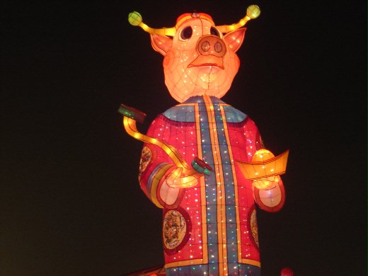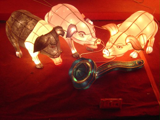 也還記得有兩年,總是會和同學去台北看花燈。後來畢業了,也就沒一起去過了。今年,第一次在桃園看花燈。當然,跟台北的燈會當然是小巫見大巫,不過還是頗有特色的。首先,主燈是 "財神豬" ,看起來果然非常富貴,真希望新的一年大家都能財運亨通。至於燈會內容,則分為三大部份。第一部份是專家的燈籠,第二部份是各級學校的燈籠、第三部份則是桃園市各里的燈籠。當然,專家登籠區果然不同凡響,做的非常精緻,也唯妙唯肖的。至於其他的燈籠也有一定的水準。