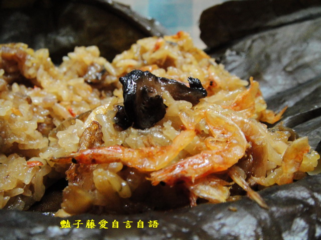 荷葉細心的呵護著櫻花蝦油飯,只為襯托出色香味俱全的美味!鋪陳的櫻花蝦帶來滿滿的幸福感!爆香的香菇絲和五花肉絲滿足了嗅覺和味蕾對於美食的想望!