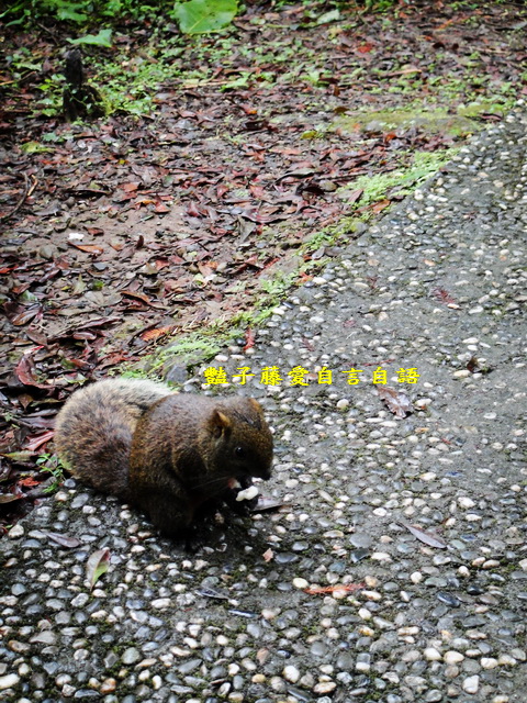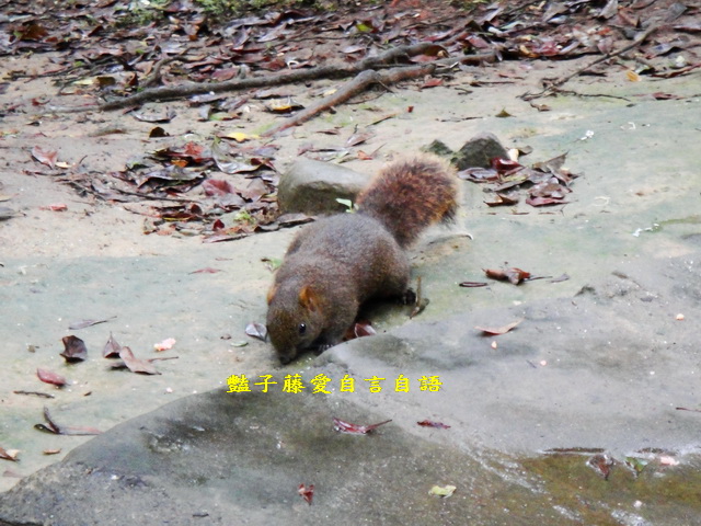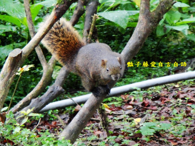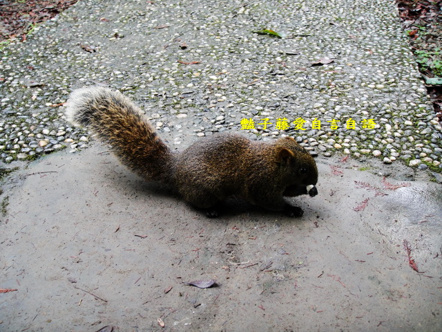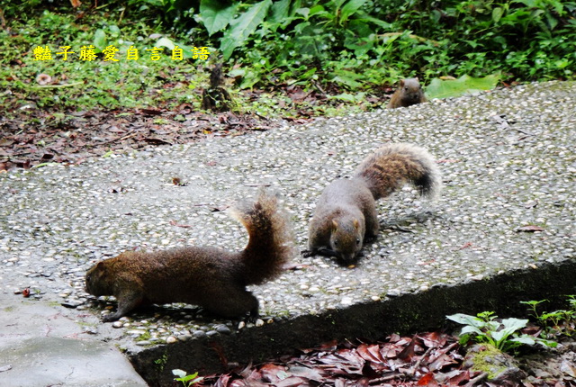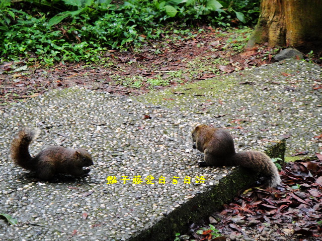 在溪頭大學池旁的樹叢中,松鼠平易近人的表演著主秀。