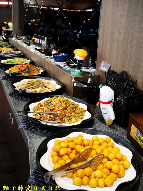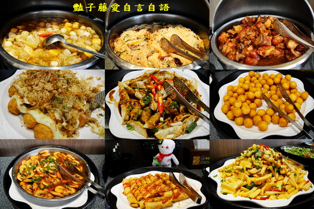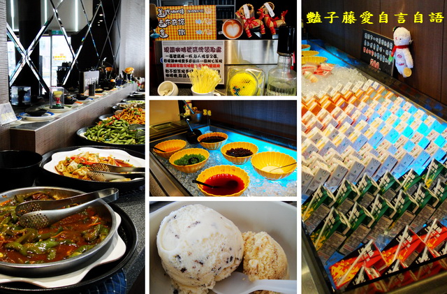 熟食區、主食小菜區、迴轉壽司、現點現做鬆餅飲料區、小火鍋料理區、蛋糕甜點櫃、沙拉吧、水果區、烤麵包區、飲料區和冰品區。