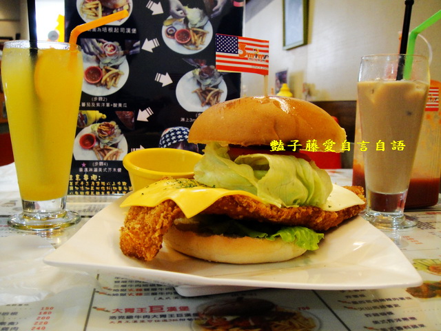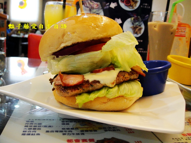 【豔子藤就是愛美食】台中美式漢堡餐廳& 3mins 美式餐廳。豬肉花生培根起司漢堡和雙料起司鱈魚堡比臉大美式巨漢堡,完全攻略開心吃!超大美式漢堡夾上生菜、番茄、酸黃瓜、紫洋蔥,淋上特調漢堡醬料,美式漢堡餐廳隨套餐附上脆薯和飲料,嗑美式巨漢堡大口吃!