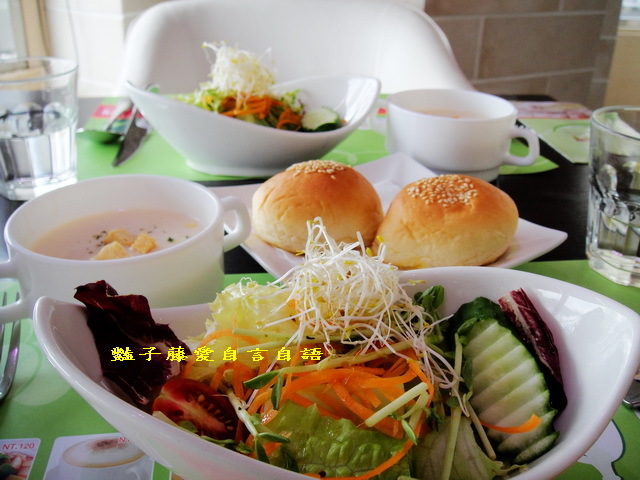 套餐有田園翠綠沙拉、主廚濃湯、佐餐麵包、飲料和甜點.