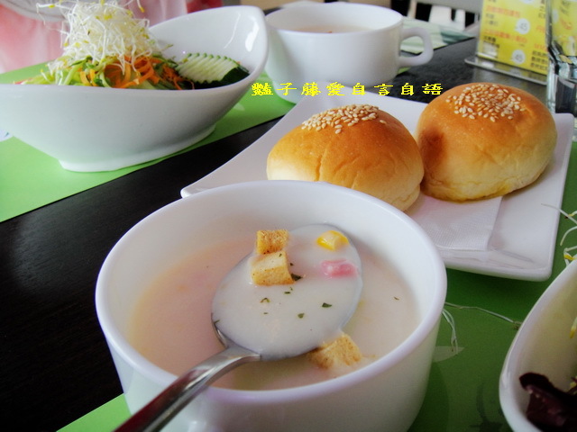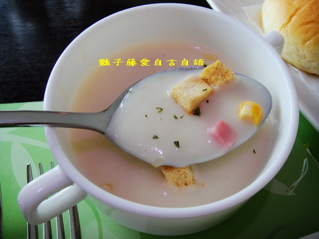 今天的濃湯是稠度恰好的火腿玉米濃湯,放上吐司丁多了一重焦脆的口感.