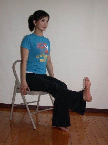 1坐直,先吸口氣,脊椎伸長,吐氣的時候將右腳打直,吸氣再放下,來回5次。