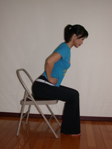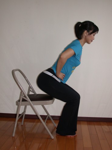 2上身往前傾,先吸氣準備,吐氣時將肚子縮緊臀部離開椅子,尾骨微內捲,重量會落在腳根上。膝蓋不超過腳趾尖。