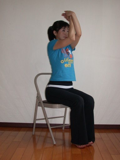 1坐直,脊椎伸長,兩手往前伸直,右手上左手下,拇指在下,十指互扣。