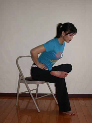 1坐正手叉腰,將右腳勾,腳踝放在左腳膝蓋上,小腿平行身體。