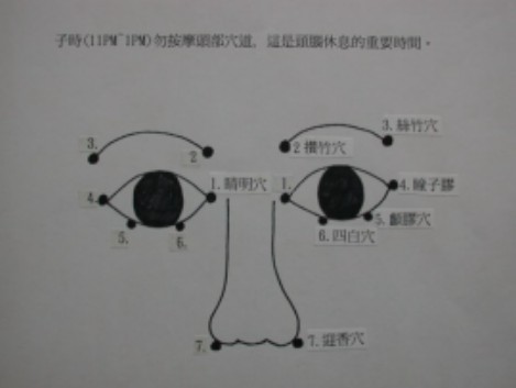 **臉部穴位的按摩很方便上班的時候施行,手肘靠在辦公桌上,用中指指腹按壓或輕揉穴位,先按壓精明穴,由內而外順著眼窩依序按壓攅竹穴、絲竹穴、瞳子膠、顱膠穴、四白穴再往下按壓鼻翼的迎香穴。