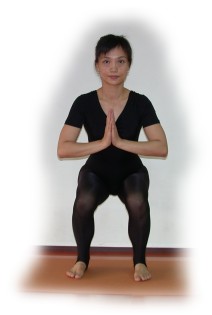 3吐氣,臀部往後推,慢慢屈膝,膝蓋不超過腳尖,背直。