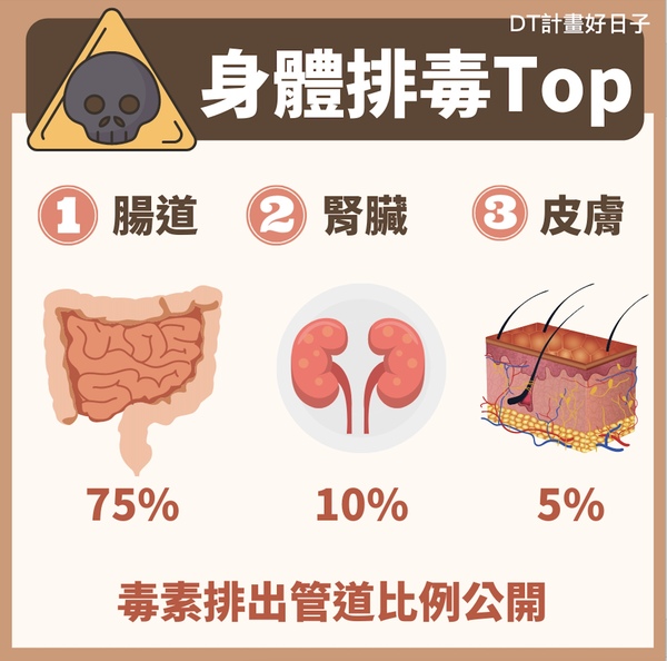 毒素是萬病之源,身體毒素累積排出的排行榜,第一名是腸道75%,第二名是腎臟10%,第三名是皮膚5%。大腸包含連接小腸的盲腸、圍成一個四方形的四段結腸,以及最後連接肛門的直腸。大腸是消化系統最後一個器官,主要功能是吸收食物中的水分及維生素與電解質,經由大腸排出的毒素,比例高達75%。