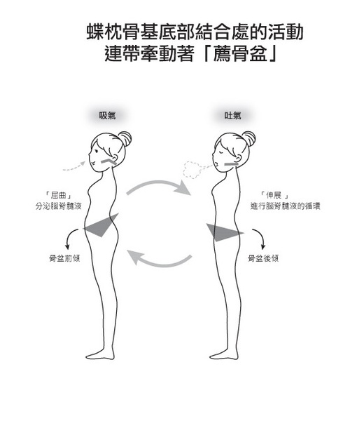 隨著骨盆呼吸,也同時能夠透過脊椎,而影響到頭部,也就是活動蝶枕骨基底部結合處,增加腦脊髓液分泌與循環。枕骨(與第一頸椎相鄰的頭蓋骨)和蝶
